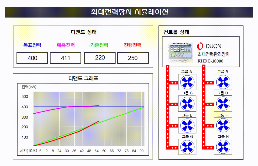 그래프에서 진행 전력이 기준 전력 이상인 경우 정보와 동시에 여러 개의 그룹 중 1개의 그룹씩 일정한 간격으로 제어를 하며, 진행 전력이 기준 전력 미만인 경우 1개의 그룹씩 일정한 간격으로 자동 복귀시켜 최대 수요전력을 자동 조절합니다.